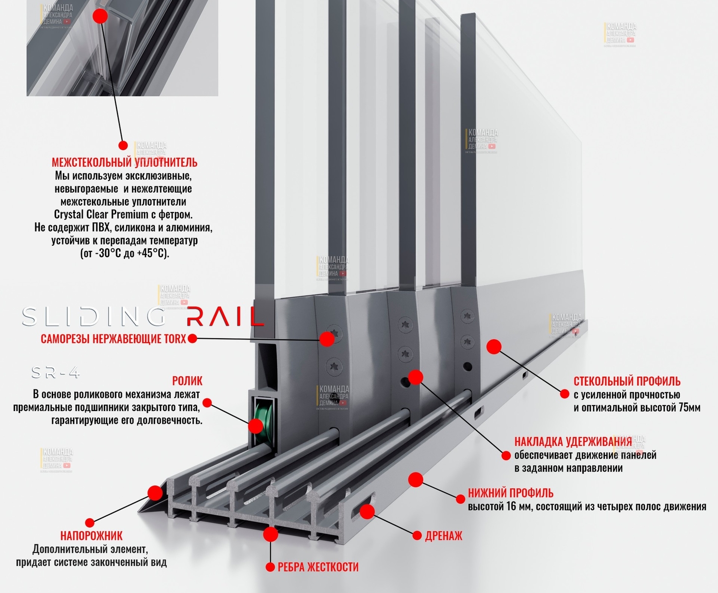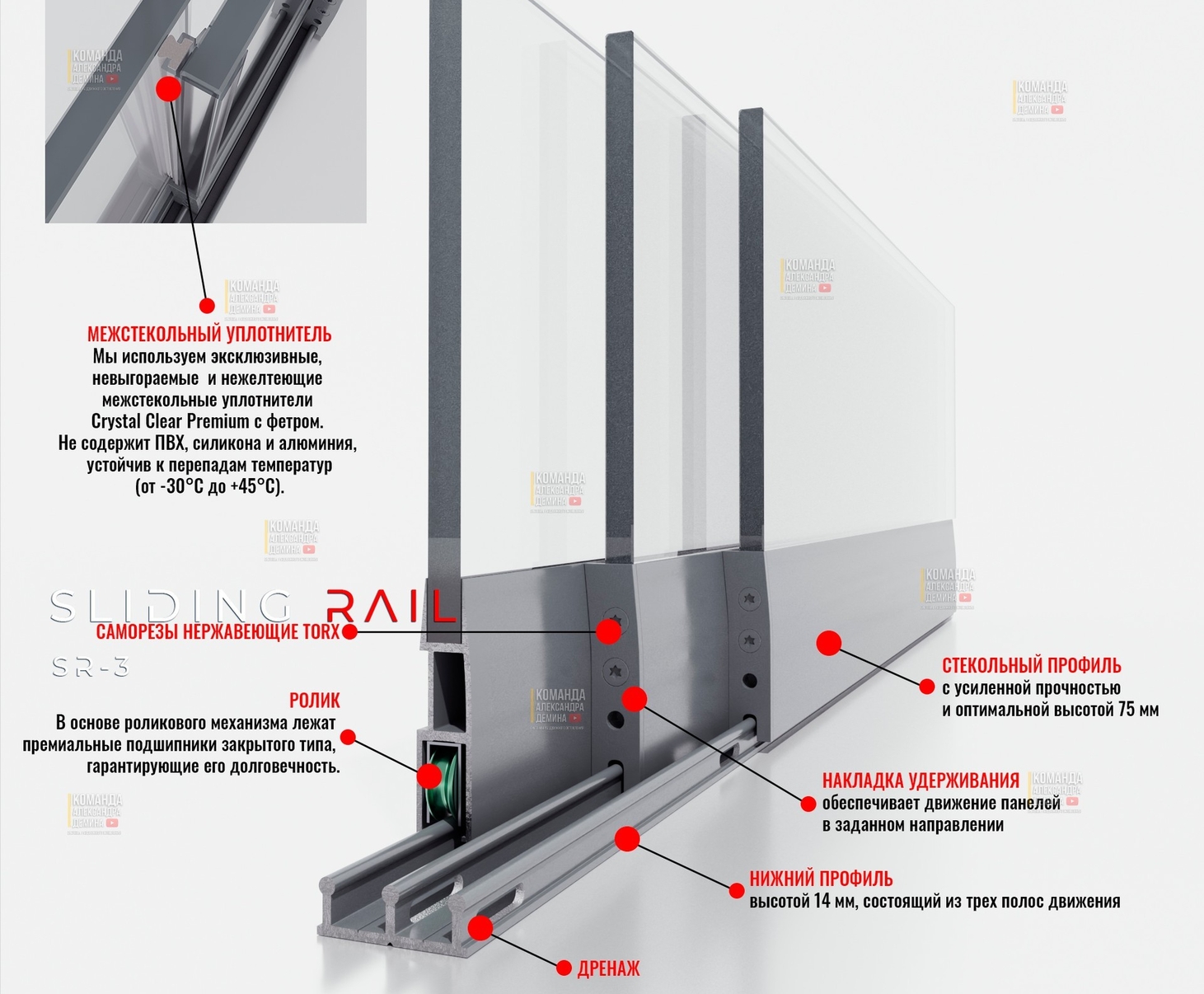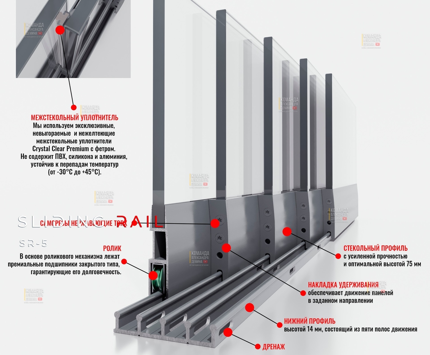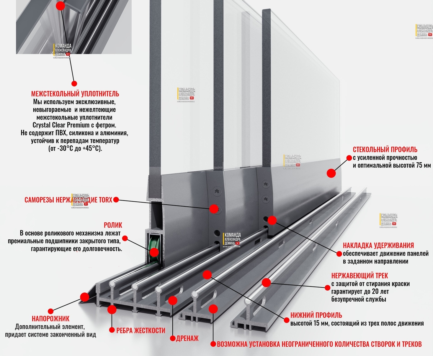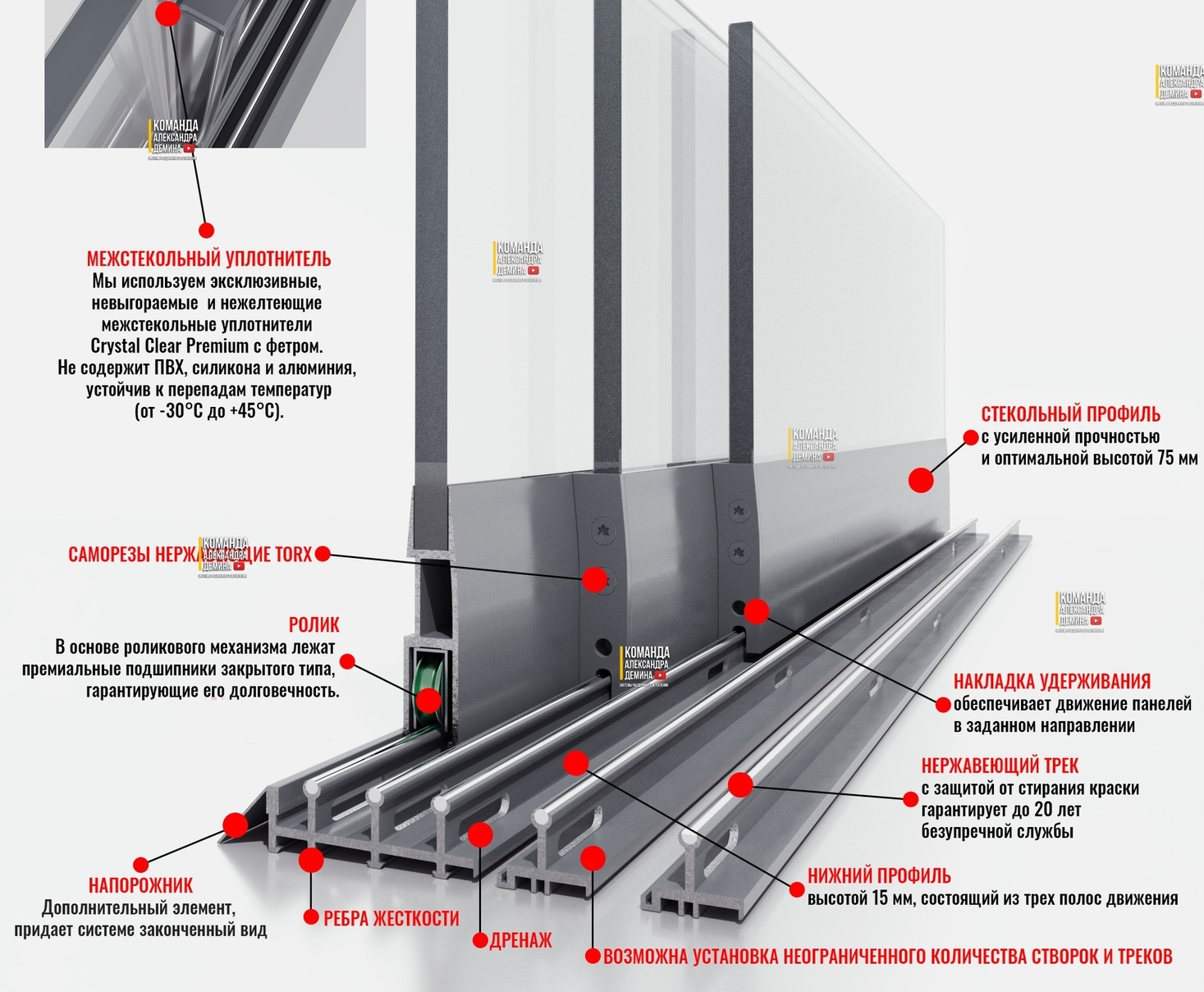 Команда Александра Демина занимается внедрением инновационных систем остекления в ваш дом и бизнес. Наша главная цель - предоставить нашим клиентам лучшие продукты по остеклению. Мы используем только высококачественные ролики для того, чтобы панели легко перемещались в проеме на протяжении всего срока использования системы. Ролики, установленные под каждой панелью, обеспечивают движение панелей весом от 300 до 350 кг.